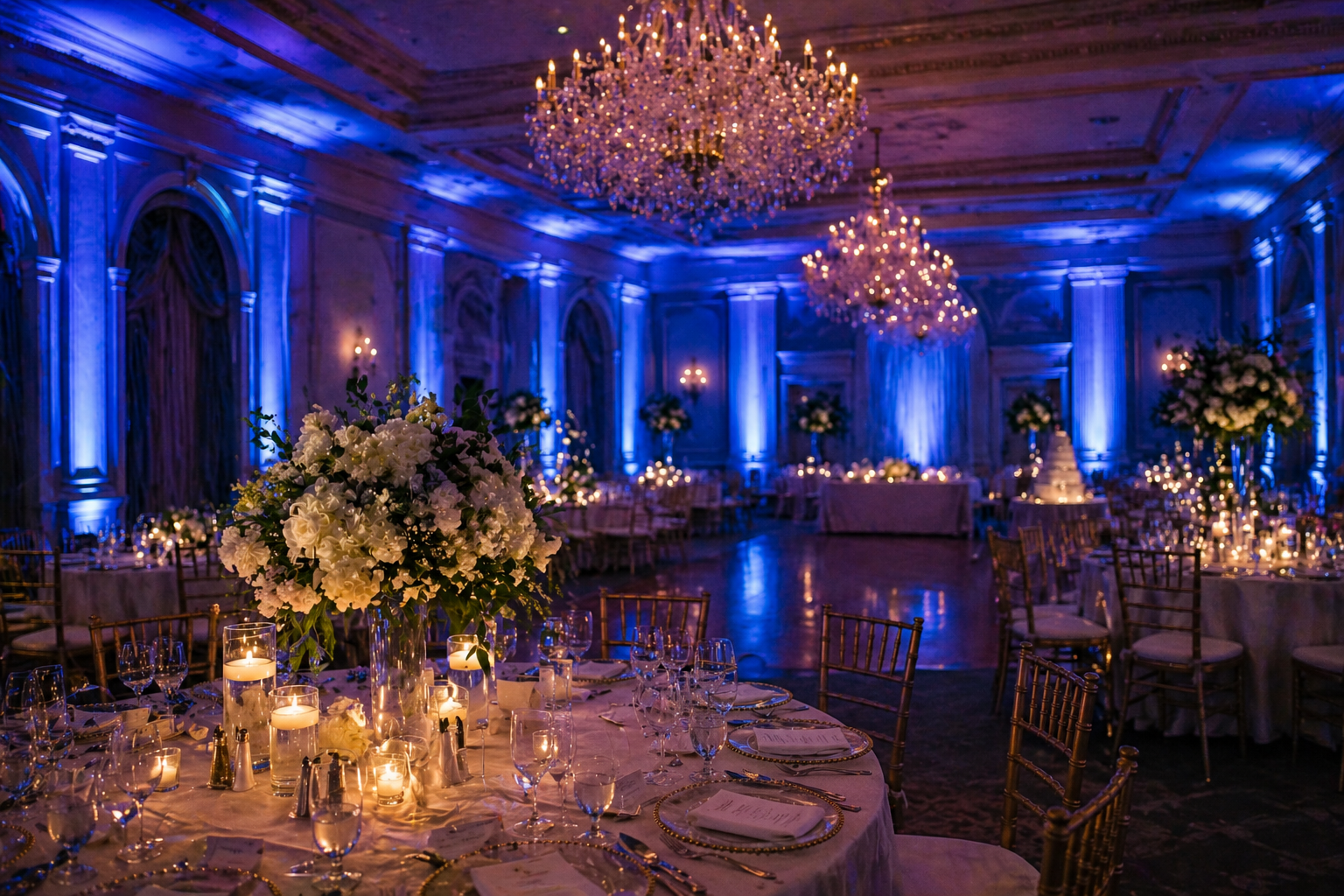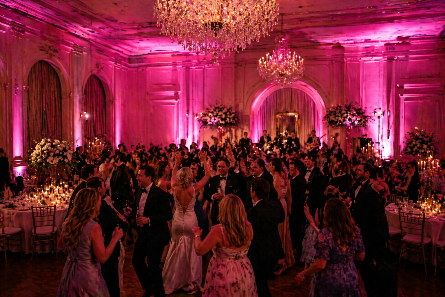 Transform your venue and set the perfect mood with professional uplighting—an easy yet impactful way to elevate any wedding or event. Strategically placed around the space, uplights cast rich, customizable colors onto walls, columns, and architectural features, instantly enhancing the atmosphere and tying your décor together. Whether you’re going for a soft, romantic glow or a vibrant, high-energy vibe, uplighting adds depth, dimension, and a polished, upscale feel that makes your event truly unforgettable.